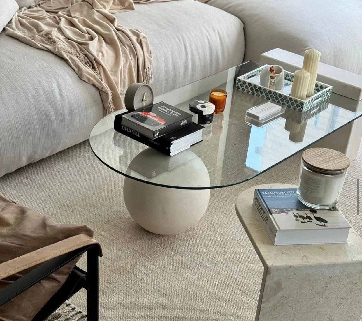 זכוכית מעל בסיס אבן יוצרים מרכז סלון רגוע ואלגנטי.