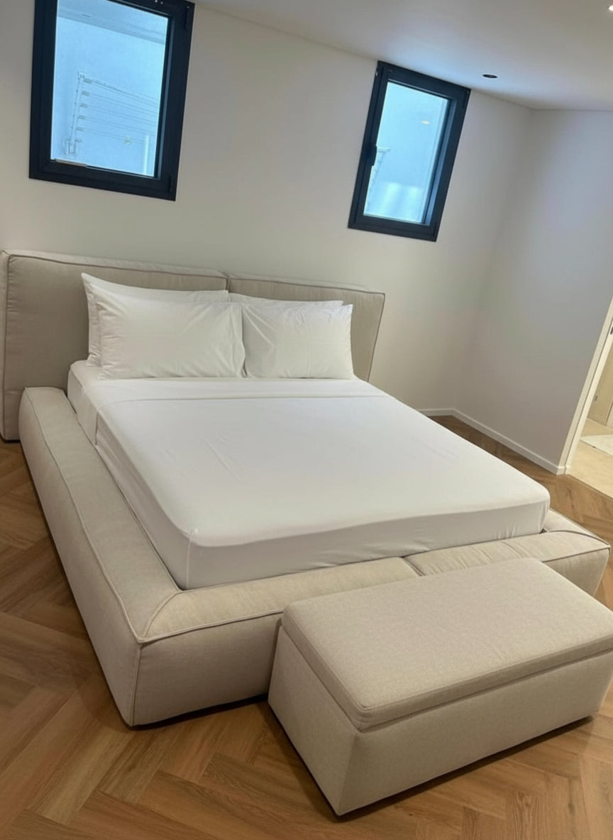 מיטה זוגית מרודפת עם בד לבחירה. המיטה בייצור אישי בעבודת נגרות איכותית והמידות הן בהתאם לדרישת הלקוח