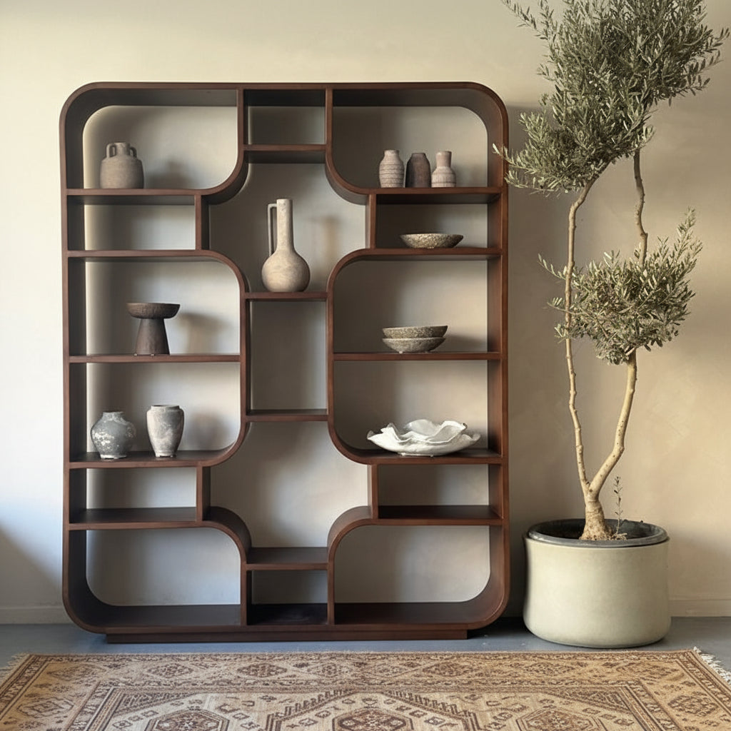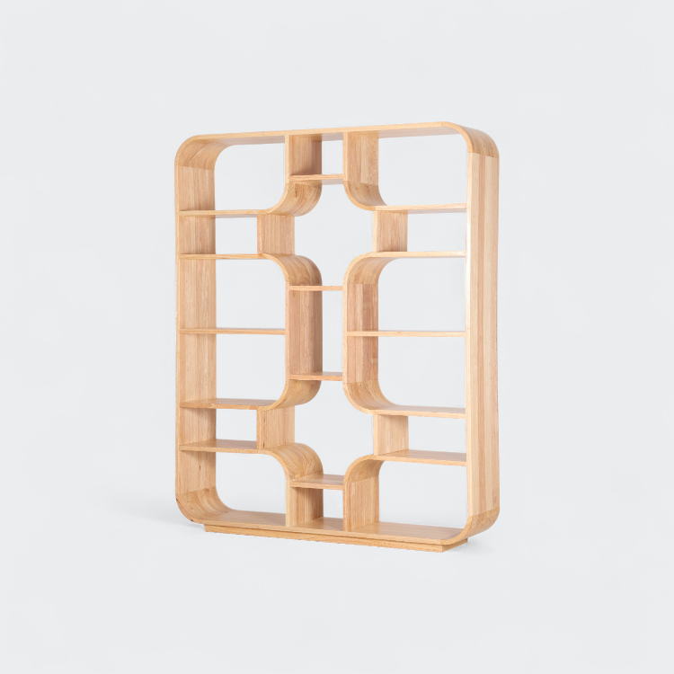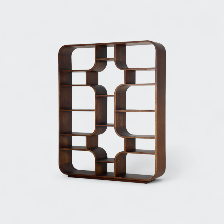 ספרייה מעוצבת בקווים מעוגלים ובחלוקה א-סימטרית, המשלבת אומנות ונגרות איכותית ליצירת פריט בולט ומרשים בכל חלל.