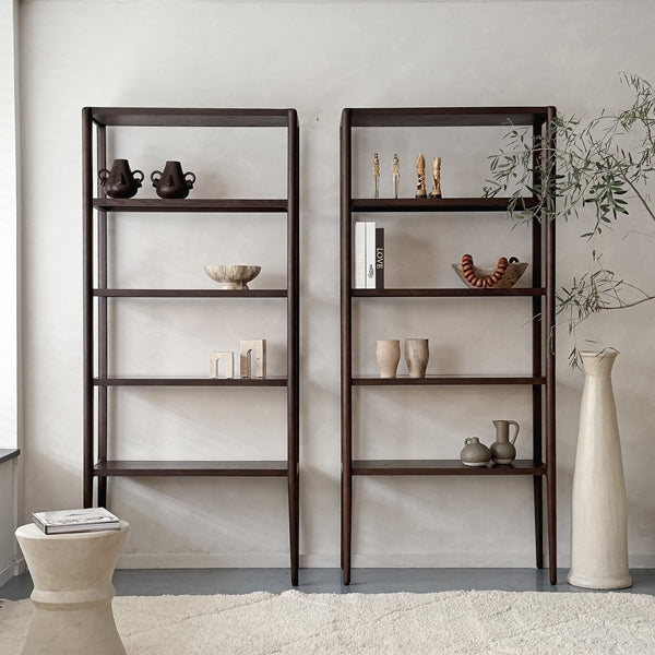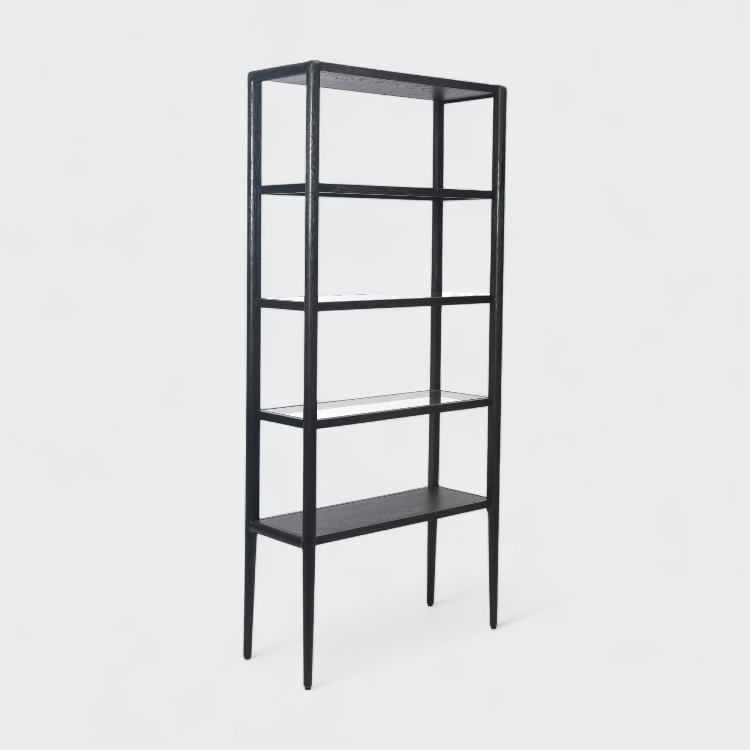 ספריית מודרנה מעץ בשילוב מדפים בזכוכית שקופה או חומה, תלוי בגוון העץ