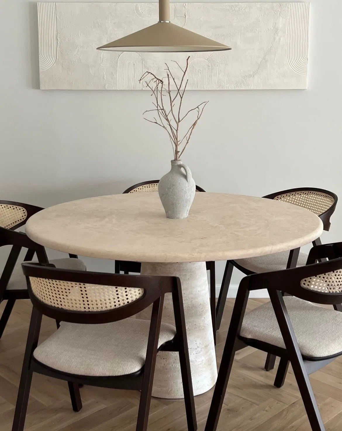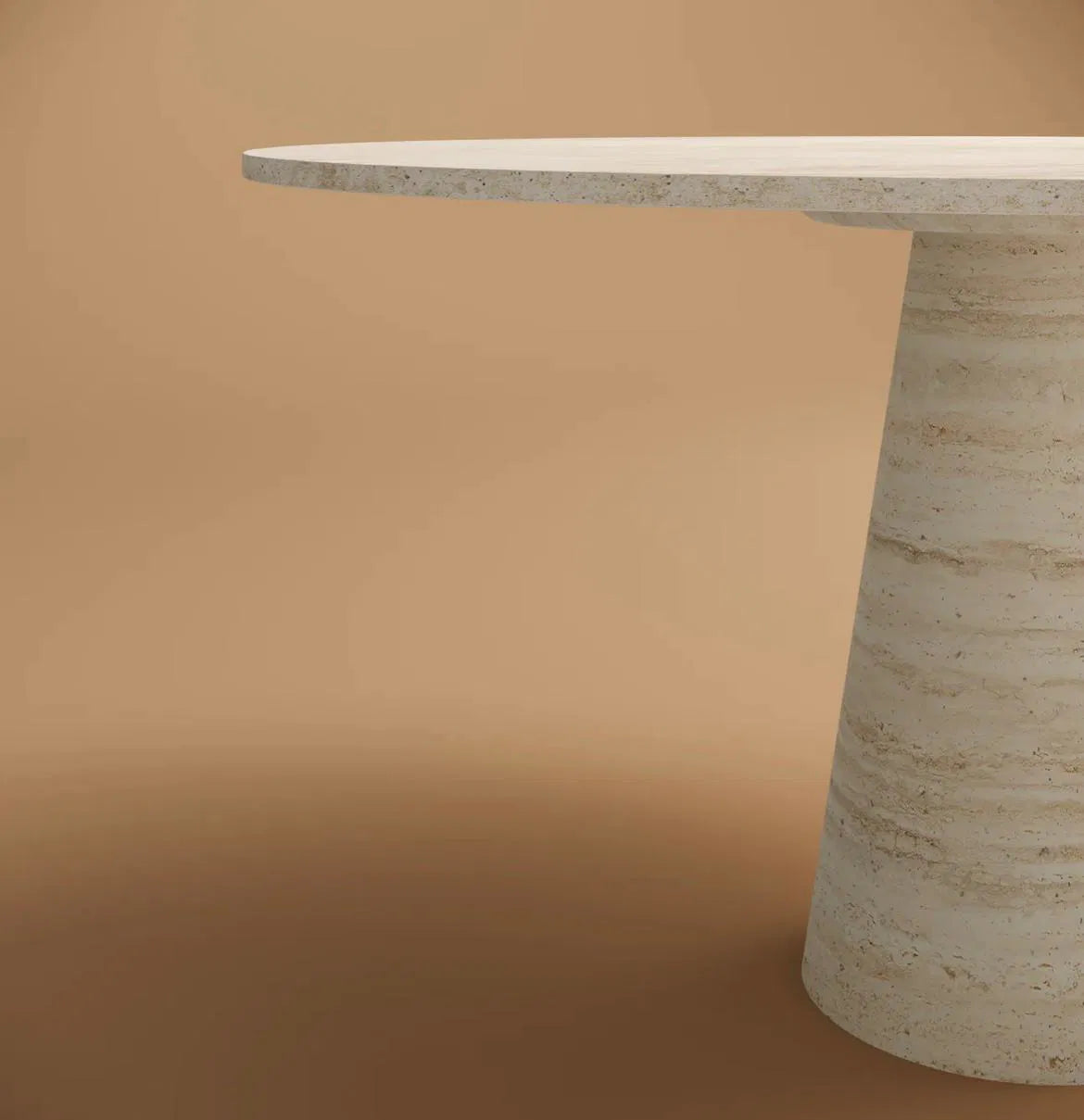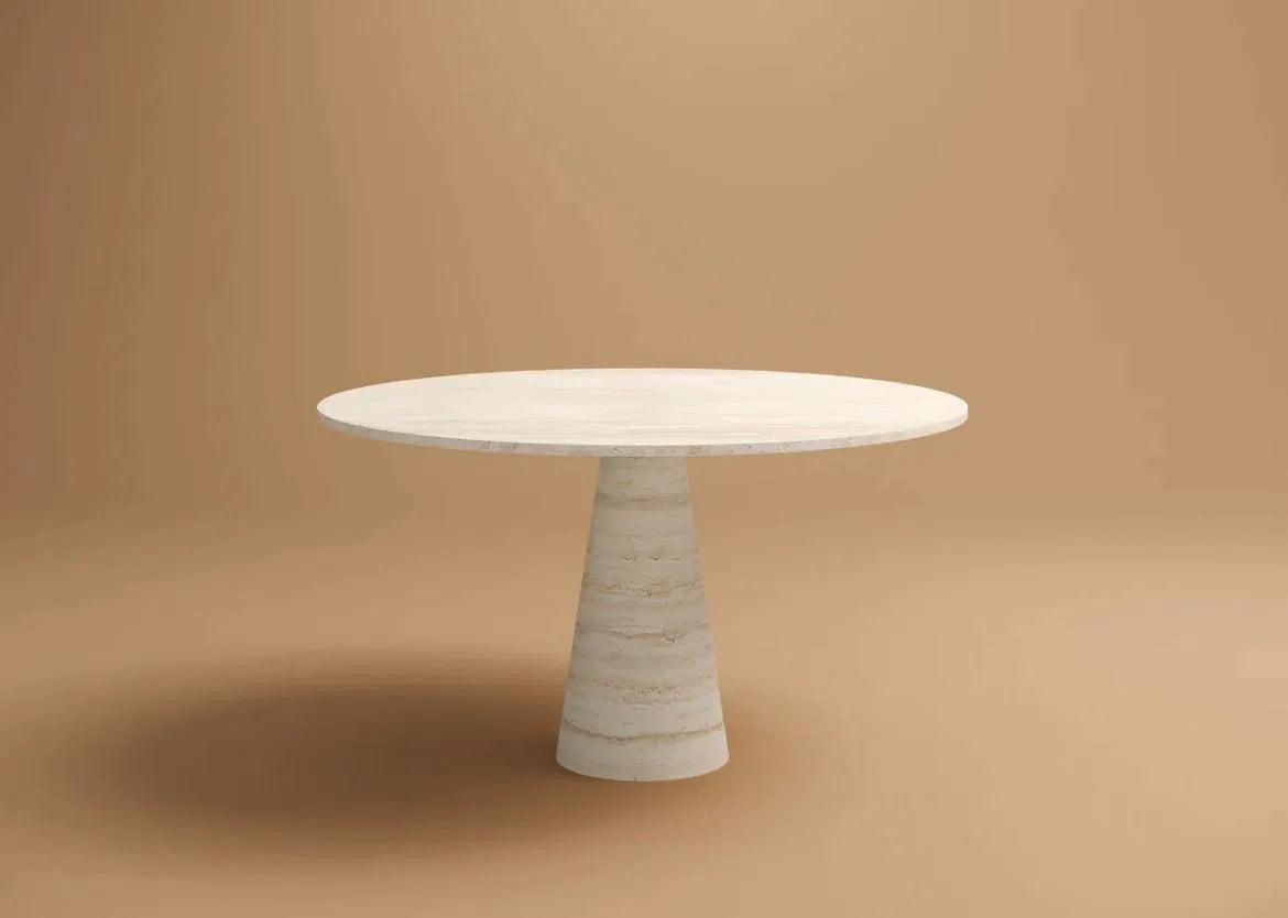 שולחן עגול משיש טרוונטין טבעי, בעיצוב נקי ומדויק המשלב יוקרה מינימליסטית ונוכחות אלגנטית.