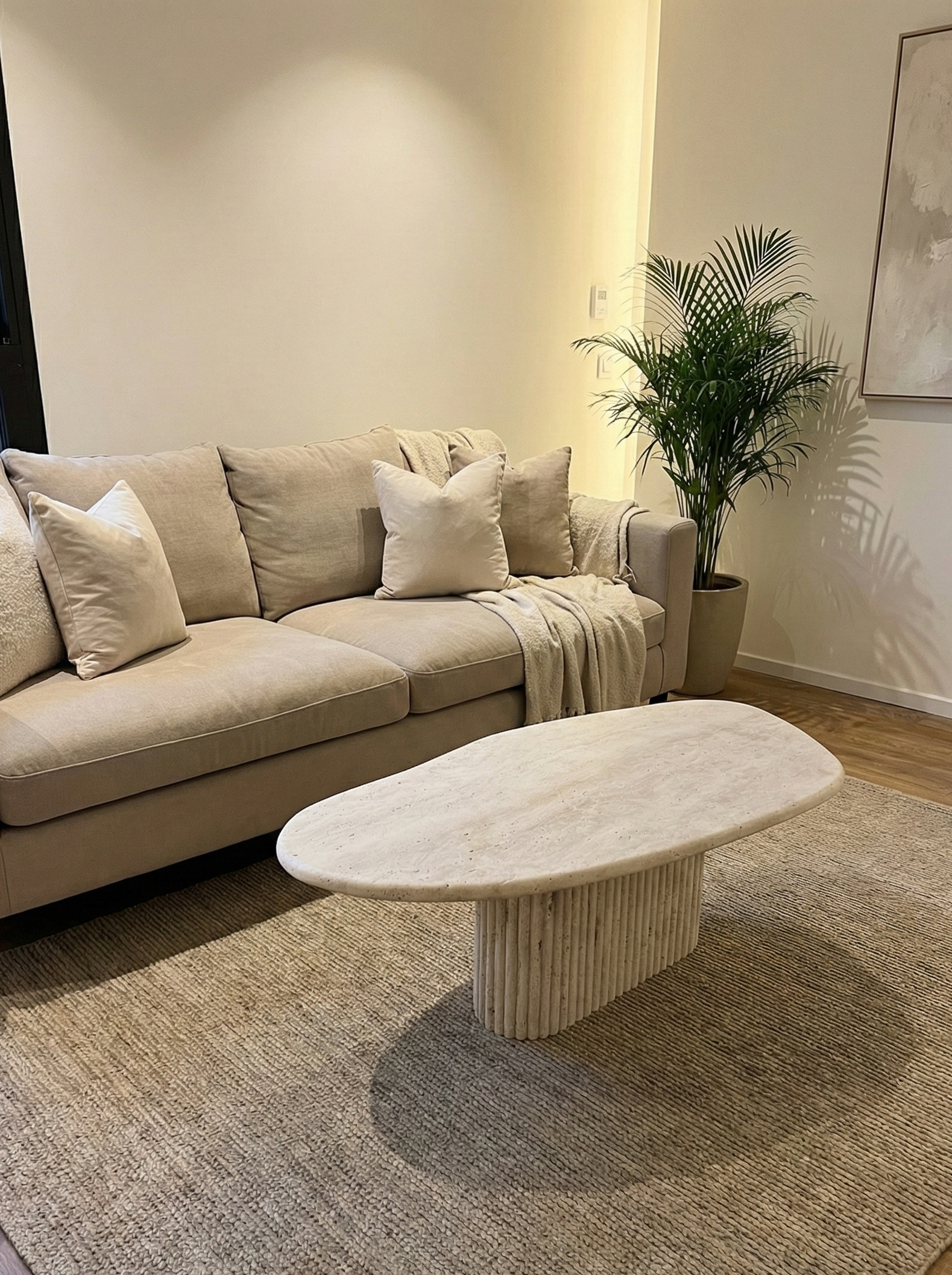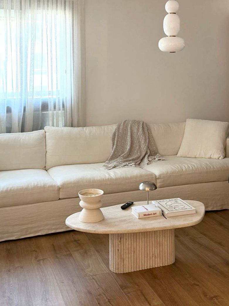שולחן סלון אמורפי עם רגל מחורצת, שולחן שמשנה כל חלל ונותן תחושה של יוקרתיות לא מתאמצת.