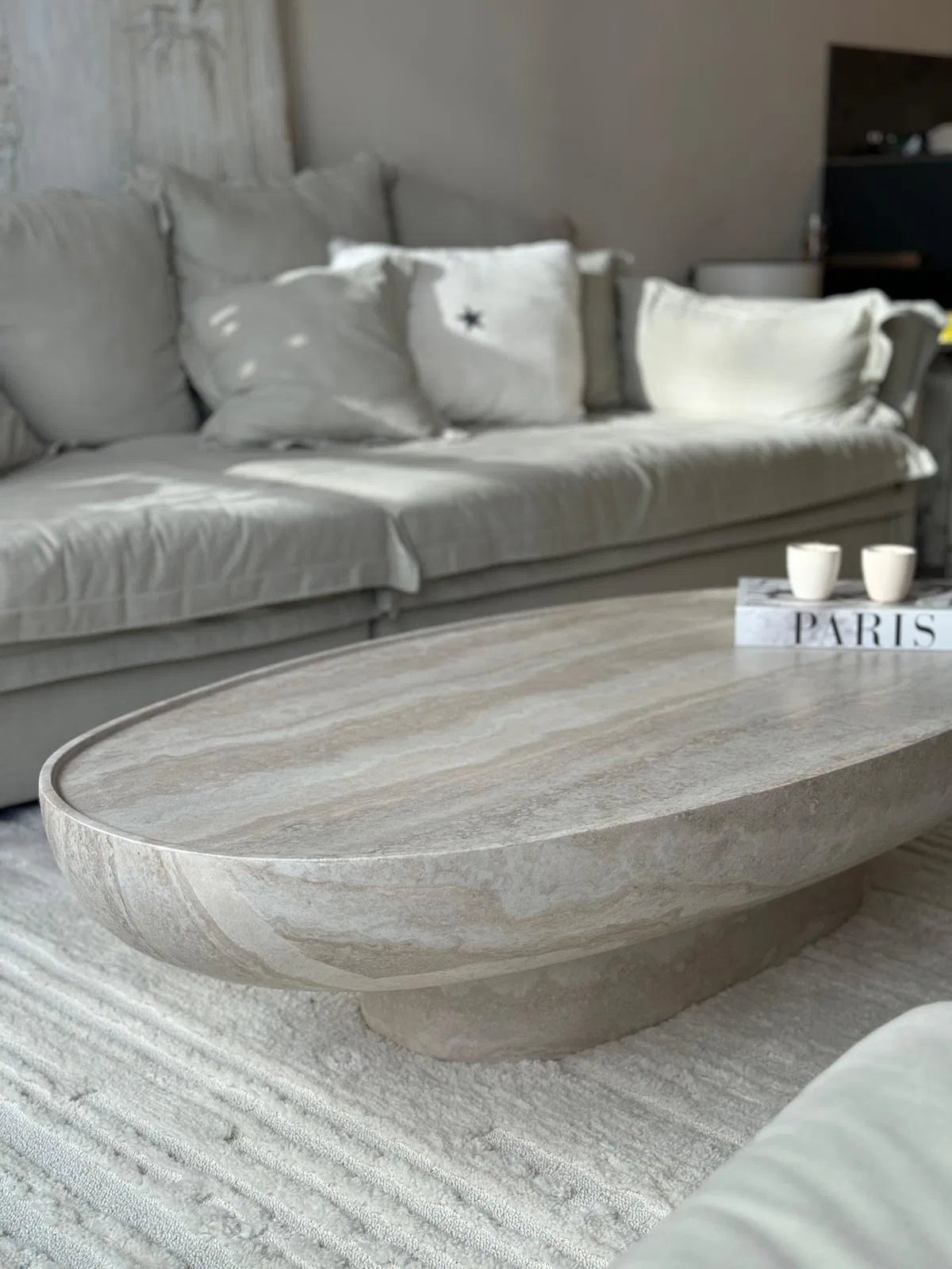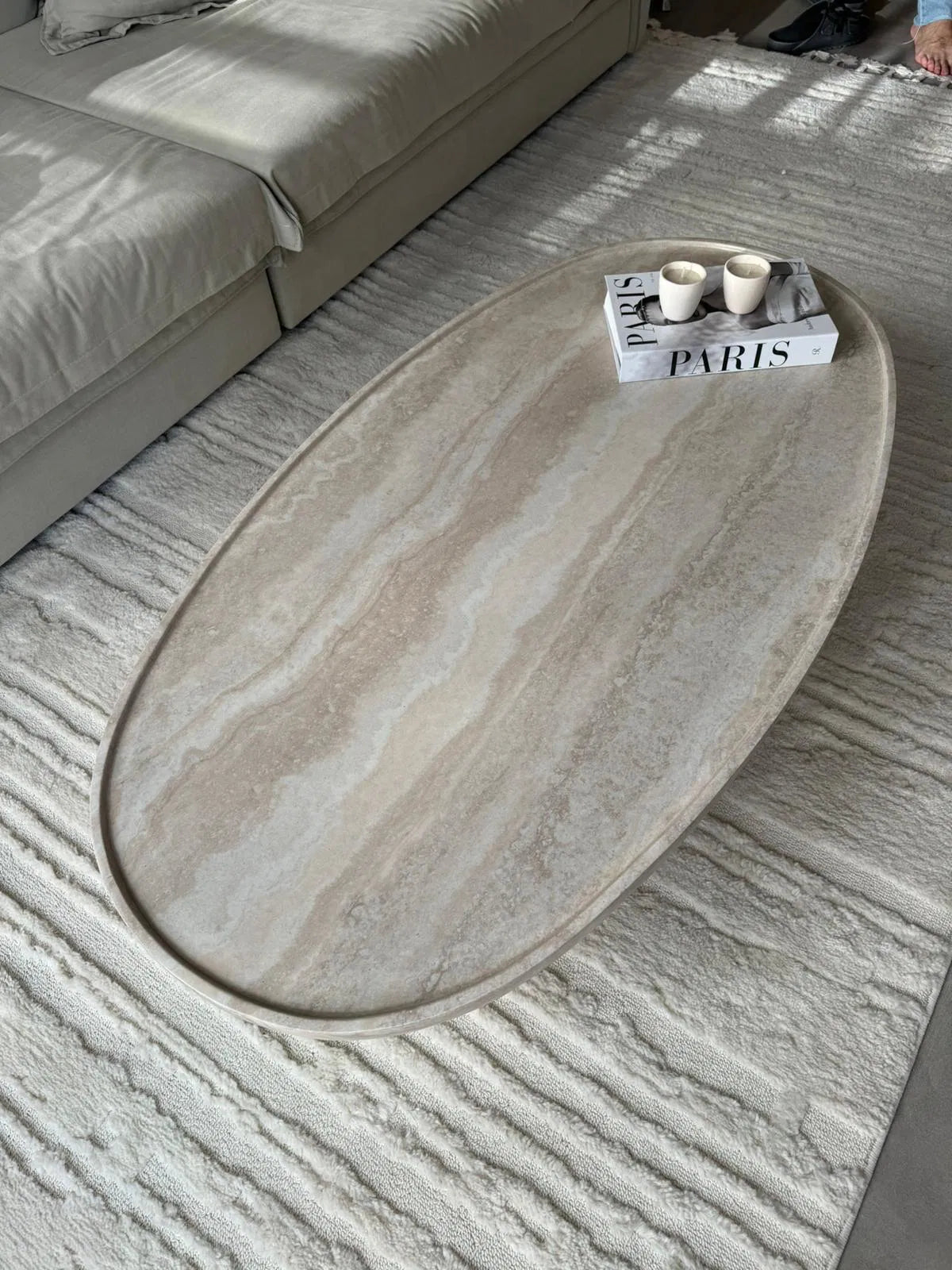 שולחן בייצור חדשני המדמה אבן טרוורטין אמיתית , קל לניקוי, ניתן להזזה ויציב מאוד. גימור אבן מדויק, שולחן שלא ניתן להתעלם מיופיו בחלל.