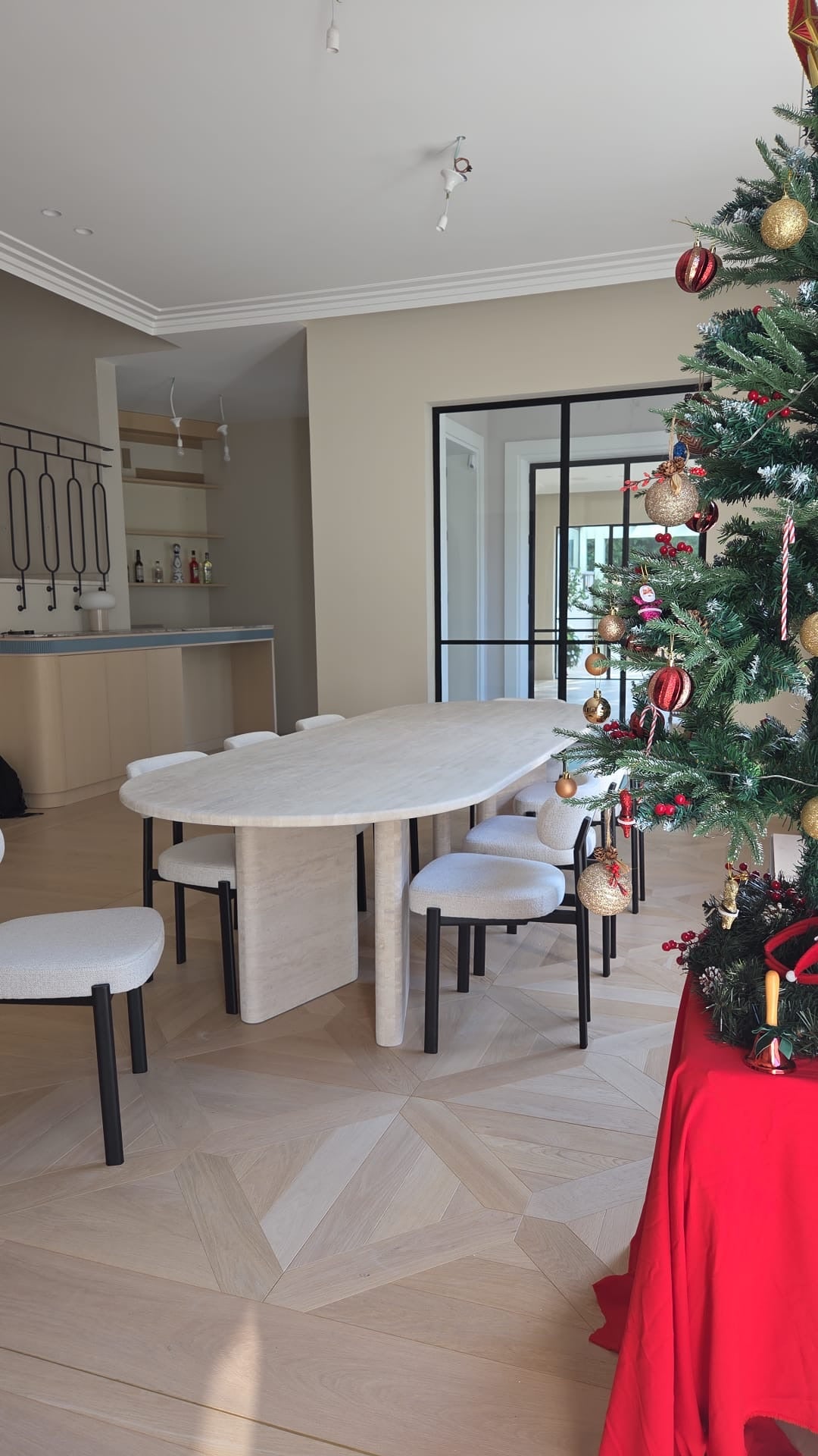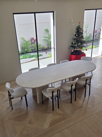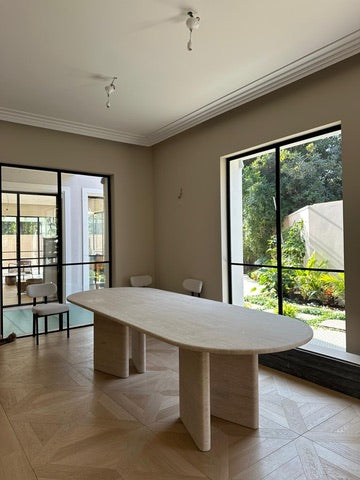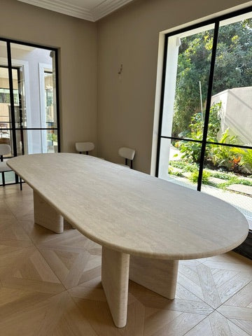 שולחן אוכל אליפטי משיש טרוונטין טבעי, עם נוכחות יוקרתית וגימור המבליט את המרקם האותנטי של האבן.